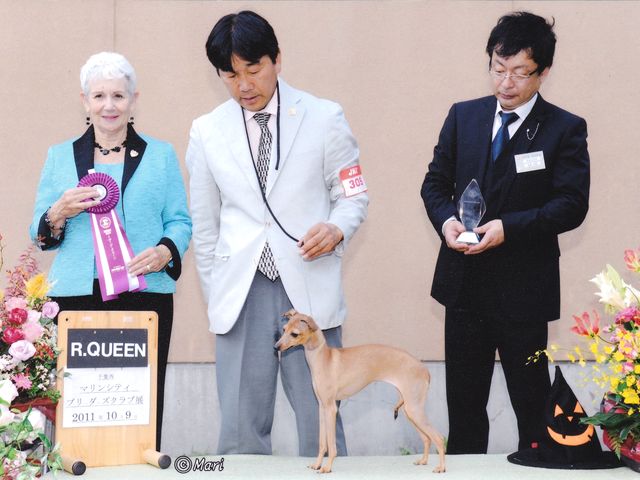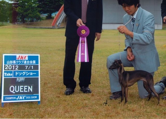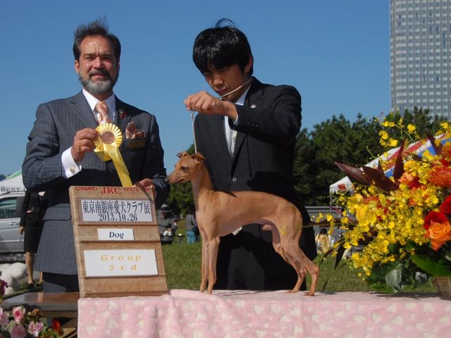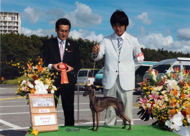 | 2012年 3月25日 JKCチャンピオン完成 2013年10月26日 東京南イタリアン・グレーハウンドクラブ第10グループ展にてBest In Show受賞 | |